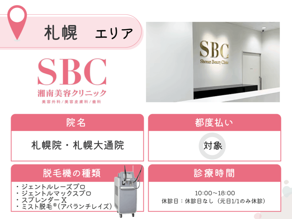 湘南美容クリニック札幌院・札幌大通院![]() | ○ | 1回:19,000円 3回:45,000円 5回:51,000円 | 1回:25,000円 3回:49,500円 5回:53,800円 | 1回:30,000円 3回:75,000円 5回:87,500円 | 10:00~18:00 休診日:休診日なし(元日1/1のみ休診) | 要確認 | 無料 | 無料 | ○ | ジェントルレーズプロ ジェントルマックスプロ スプレンダーX ミスト脱毛®(アバランチレイズ) | ①北海道札幌市中央区北5条西2-5 JRタワーオフィスプラザさっぽろ13F ②北海道札幌市中央区北一条西3-3-10 KOKOHOTEL札幌駅前 3階 |